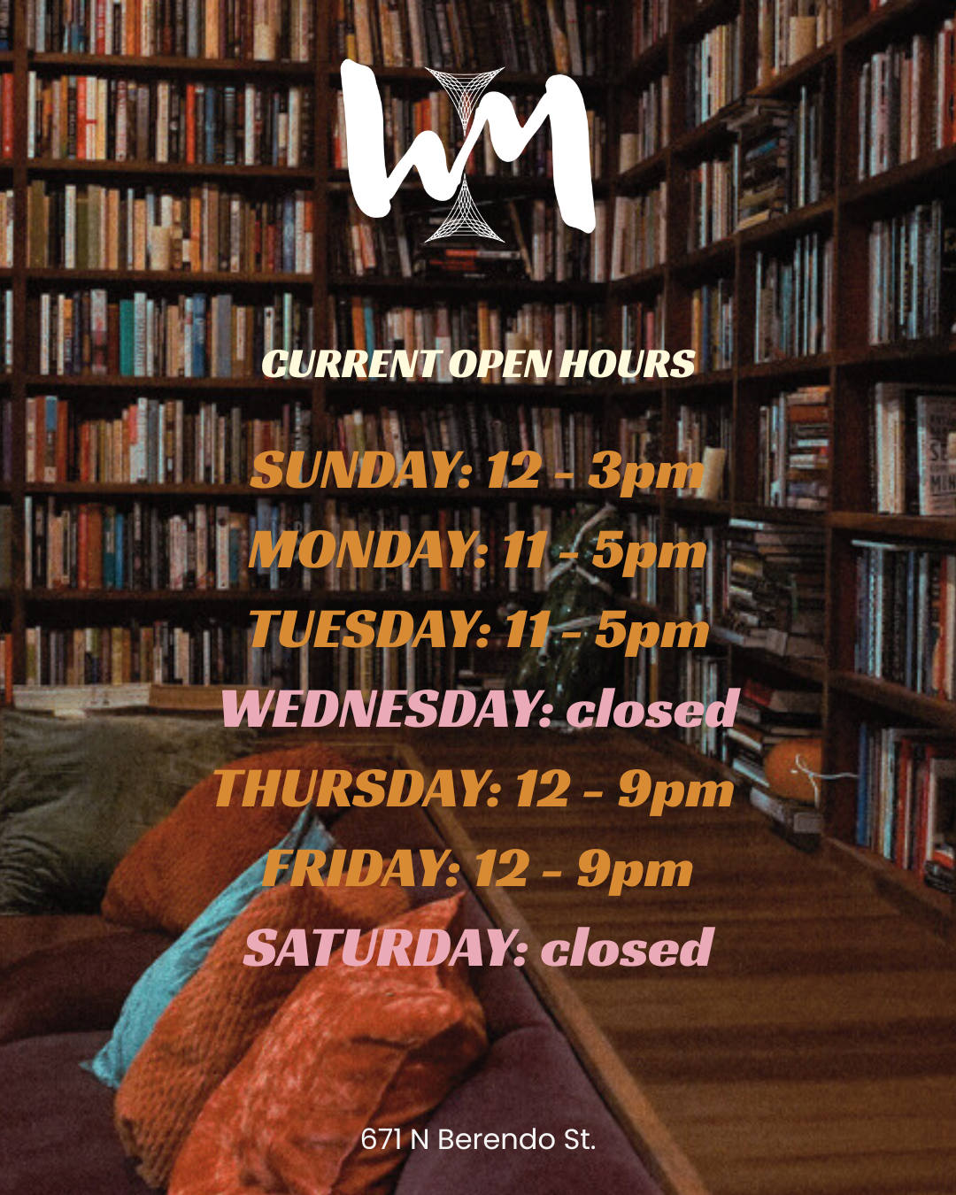 WuːuM will be open throughout the week as a space to read, work, gather, reflect, and connect. Whether you’re stopping by for quiet time in the library or staying late for conversation and community, here’s when you can find us: